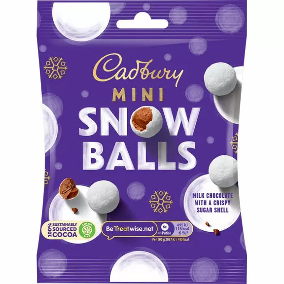Cadbury Snow Balls are one of the bestselling Christmas novelty bags in the UK. Nothing tastes more like Christmas than Snow Balls! Smooth Dairy Milk chocolate, crispy white dusted icing sugar shell. Packed in generous 80g bags, they're perfect for sharing.