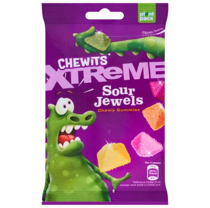 Chewits Jewels Sour Mix. Watermelon, Cherry, Orange, Pineapple, Apple. No artifcial colours and flavours.