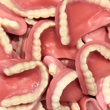 Dentures are fun gummy sweets that look just like a set of teeth! With a delicious strawberry and cream flavour and jelly like texture, these sweets are the perfect novelty pick and mix sweet