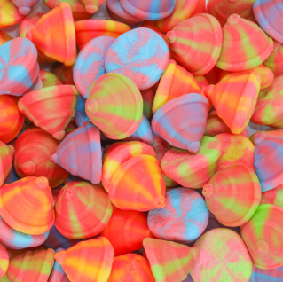 A rainbow spinning top of many colours, hard exterior with a soft jelly like centre.. these are delicious!
