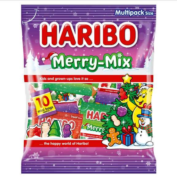 Enjoy a merry mix of shapes and flavours with Haribo Merry-Mix. Inside each 160g multipack, you'll find approximately 10 bags filled with a mix of merry shapes & flavours, including Strawberry Candyfloss & Marshmallows, each bursting with flavour and festive spirit. Made with no artificial colours and ideal for stockings, these multipacks are sure to bring the holly-jolly to your festive range. Kids and grown-ups love it so... the happy world of Haribo!