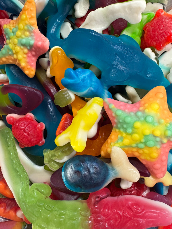 Ingredients: Sugar, Glucose Syrup, Wheat Starch, Water, Pork & Beef Gelatine, Modified Maize Starch, Acids (Lactic Acid, Malic Acid, Citric Acid),Acidity Regulator (Sodium Malates), Modified Poatato Starch, Acidity Regulator (Sodium Malates,Sodium Hydrogen Carbonate), Flavouring, Plant and Vegetable Concentrates (Spirulina, Safflower, Black Carrot) E100, E120, E133, E171, humectant: glycerol; Caramel Syrup, Humectants (Sorbitols) Glazing Agents (Beeswax, Carnauba Wax)