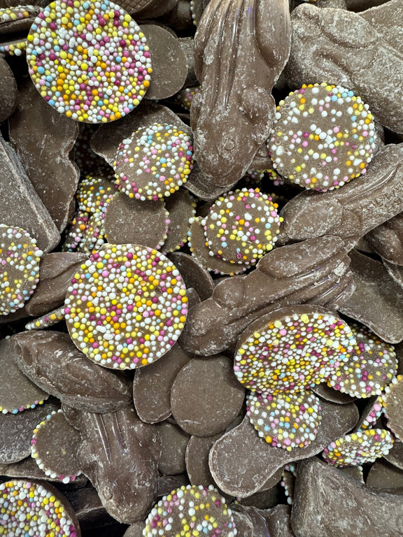Sugar, Vegetable Fat (Palm), Whey Powder (From Milk), Wheat Flour, (With Added Calcium, Iron, Niacin, Thiamin), Wheat Starch, Fat Reduced Cocoa Powder, Glucose Syrup, Emulsifier: Rapeseed Lecithin; Natural Flavourings, Glazing Agent: Beeswax; Natural Colour: Curcumin; Colouring Foods: Beetroot Juice Concentrate, Spirulina Extract.