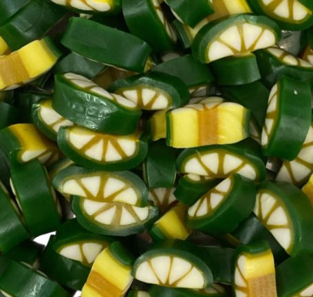 Lemon & Lime flavoured sweets with a sugar paste filling and small pieces of liquorice inside