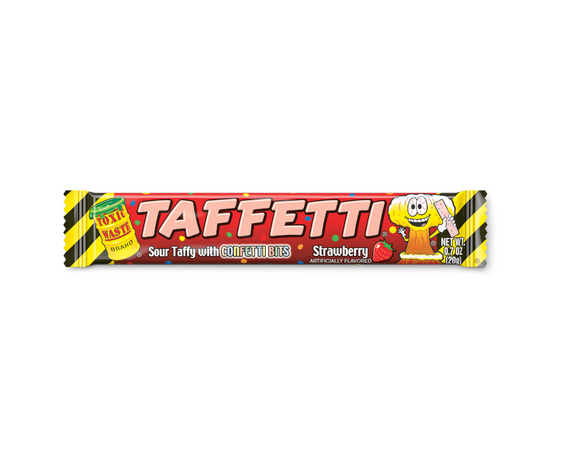 Toxic Waste Taffetti – Strawberry: Sweet meets sour in the most explosive way with Toxic Waste Taffetti Strawberry. These chewy taffy ribbons are bursting with bold strawberry flavour and loaded with colourful, fruity confetti bits that add a fun crunch to every bite. The signature Toxic Waste sour kick hits first, followed by a smooth wave of juicy sweetness that keeps you coming back for more. Taffetti Strawberry is a vibrant, tangy treat that’s as playful as it is delicious.