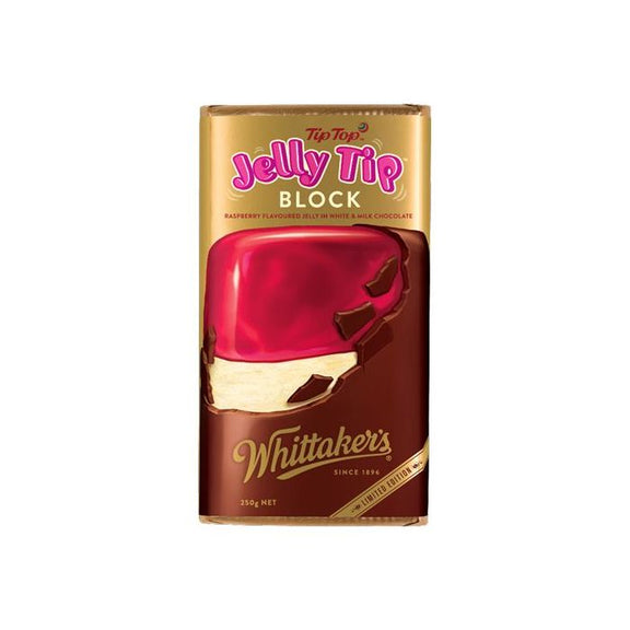 This limited edition Whittaker's Jelly Tip Block combines divine vanilla white chocolate, sweet raspberry flavoured jelly filling and Whittaker's smooth Creamy Milk chocolate for a complete Tip Top Jelly Tip hit.